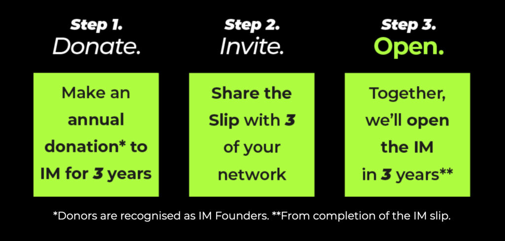 Once the museum is open, the IM will invite all IM Founder Donors (or their representative) to sign a physical IM Slip as a lasting legacy for the sector.